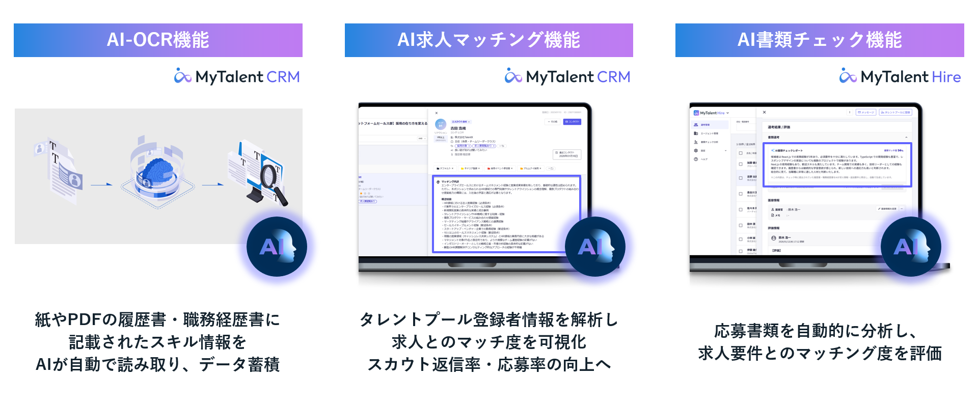 「MyTalent AI Core」は、「MyTalent Platform」内の採用CRM、候補者管理、採用ブランディングといったモジュールを横断的に支えるインテリジェンス基盤です。単なる自動化機能の集合体ではなく、以下の3つの特徴を通じて、企業の採用戦略を次世代へと引き上げます。