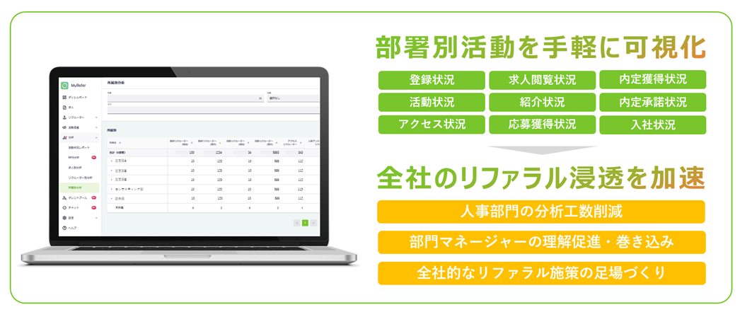 2025年9月に提供開始された本機能は、各部署の登録・紹介・応募・内定・入社までの主要KPIを一覧表示できるダッシュボード機能です。従来はCSV抽出やExcelでの手動加工が必要だった部署別の実績集計が、MyReferの管理画面上でリアルタイムに把握可能になりました。