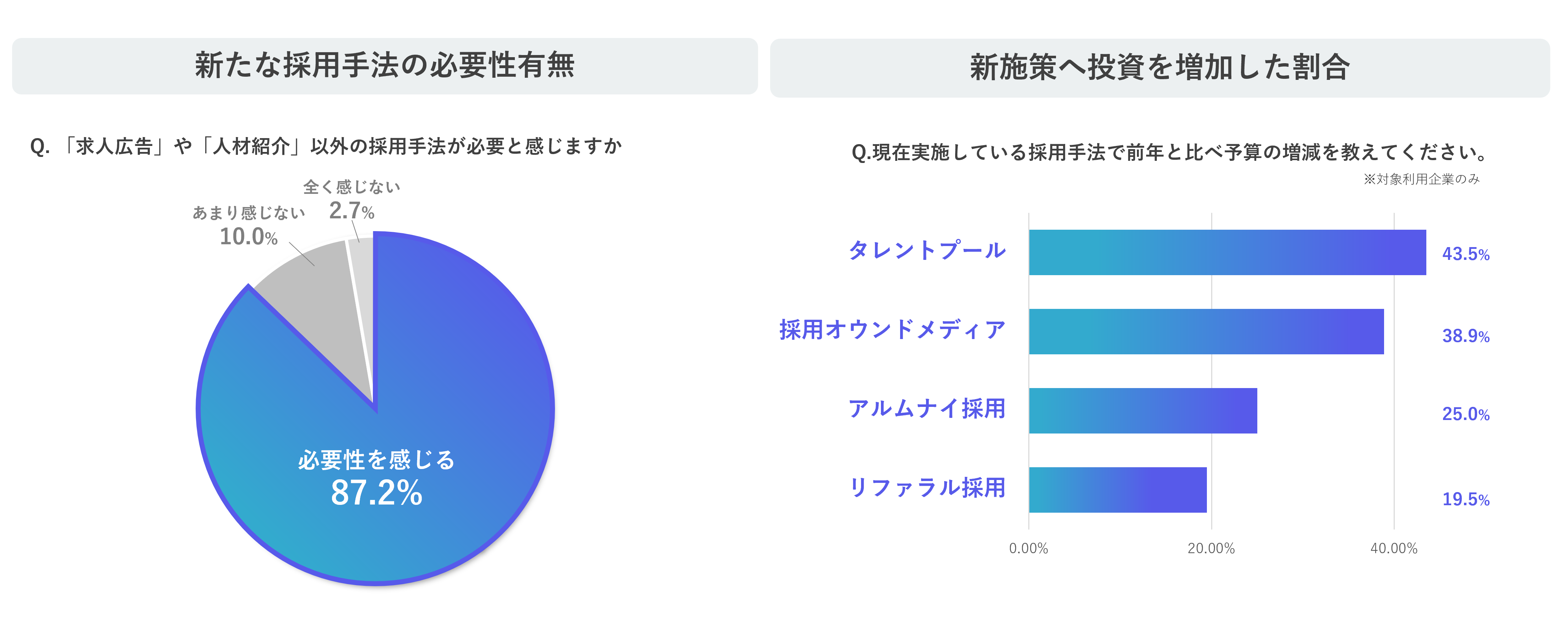 採用手法に加え、候補者側の行動変化も、2025年を通じて顕在化しました。「求人広告・人材紹介以外の新たな採用手法が必要」と回答した企業は87.2%に達し、従来の採用手法による人材獲得の難易度は高まっています。その結果、リファラル採用(実施58.4%)、アルムナイ施策(実施42.0%)、過去応募者や辞退者へのアプローチを行うタレントプール施策(実施31.5%、検討含め63.0%)など、将来の候補者との関係性を前提とした取り組みが広がりを見せました。採用は「今すぐ転職する人を奪い合う活動」から、「関係性を育て、タイミングを待つ活動」へと、重心を移しつつあります。
