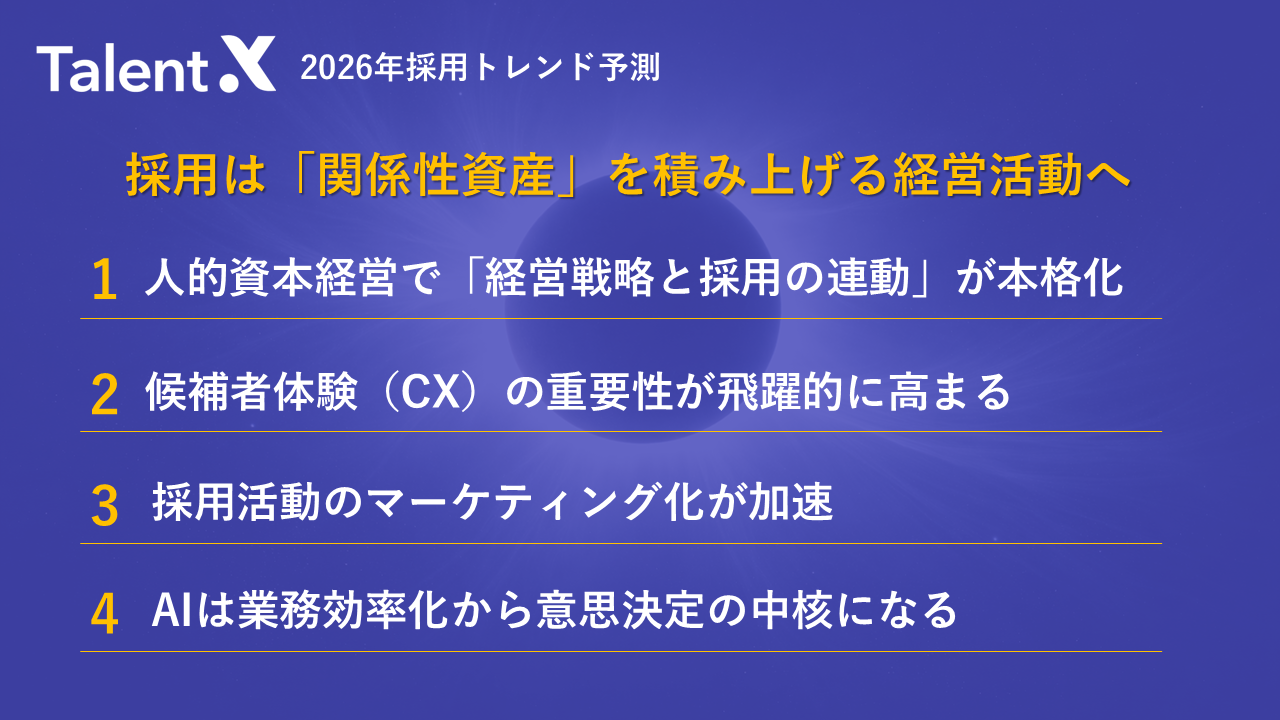 株式会社TalentX(本社:東京都新宿区、代表取締役社長CEO:鈴木 貴史、証券コード:330A、以下「当社」)は、日本の採用市場の2025年総括と、2026年採用トレンド予測を発表いたします。