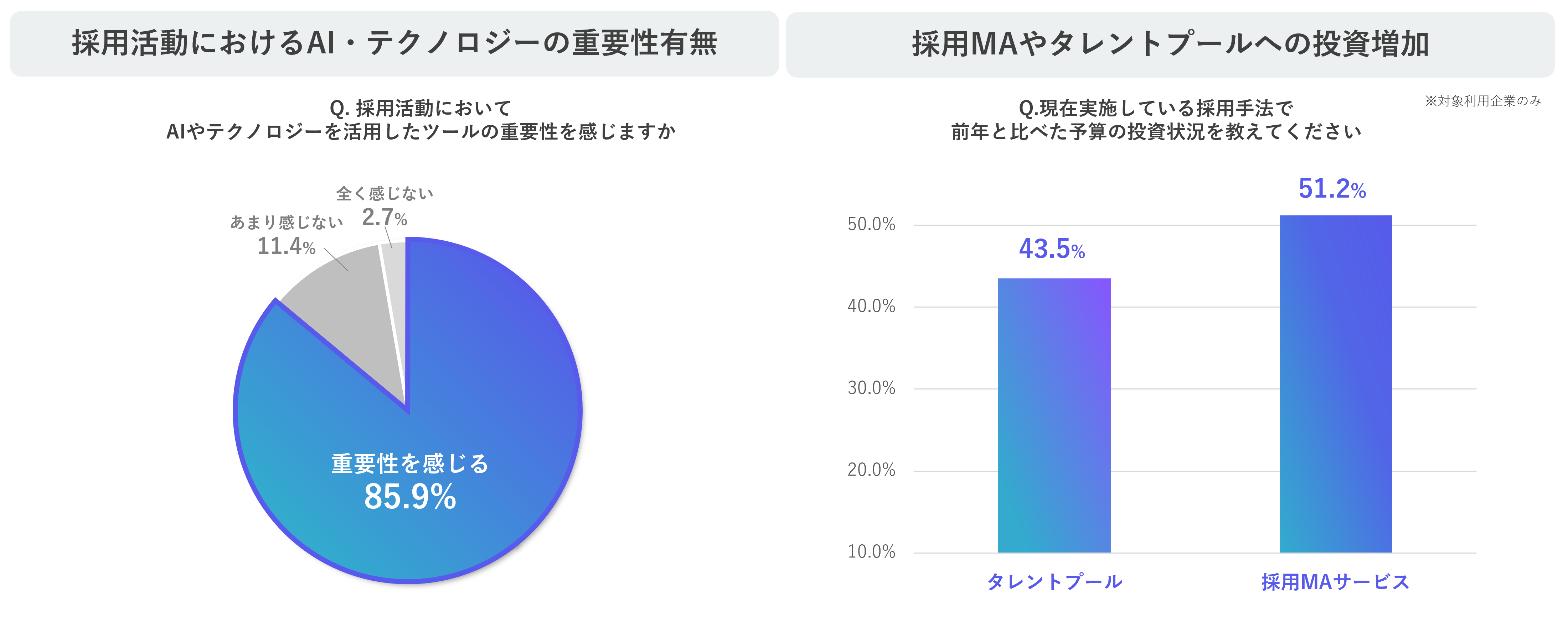 こうした背景のもと、採用を持続させるため、テクノロジーと仕組みに支えられる採用への変革が加速した一年でした。調査では、採用活動において「AIやテクノロジーの活用」が重要だと感じている担当者は85.9%にのぼりました。タレントプールの予算を「増加」と回答した企業は43.5%、採用MAサービスの予算を「増加」と回答した企業は51.2%と、候補者との継続的な関係構築を目的とした仕組みへの投資が進んでいます。AIやテクノロジーは、もはや一部の先進企業だけの最先端の選択肢ではなく、採用を持続させるための標準装備となりつつあります。