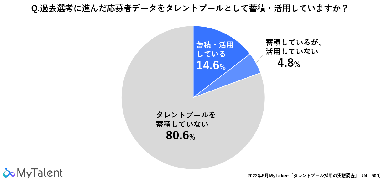 一方で、過去応募者のタレントプールを戦略的に蓄積している企業は19.4%、その中でもタレントプールを活用している企業は14.6%にとどまりました。まだ8割以上の人がタレントプールを戦略的に蓄積できていないと明らかになりました。