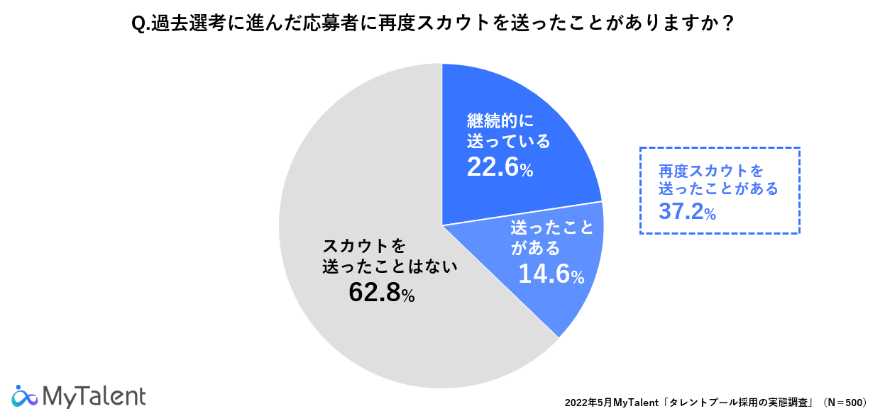 過去選考に進んだ応募者に対するスカウトについて、「継続的に送っている」(22.6%)、「送ったことがある」(14.6%)と3社に1社は再度スカウトを送っていると回答しました。