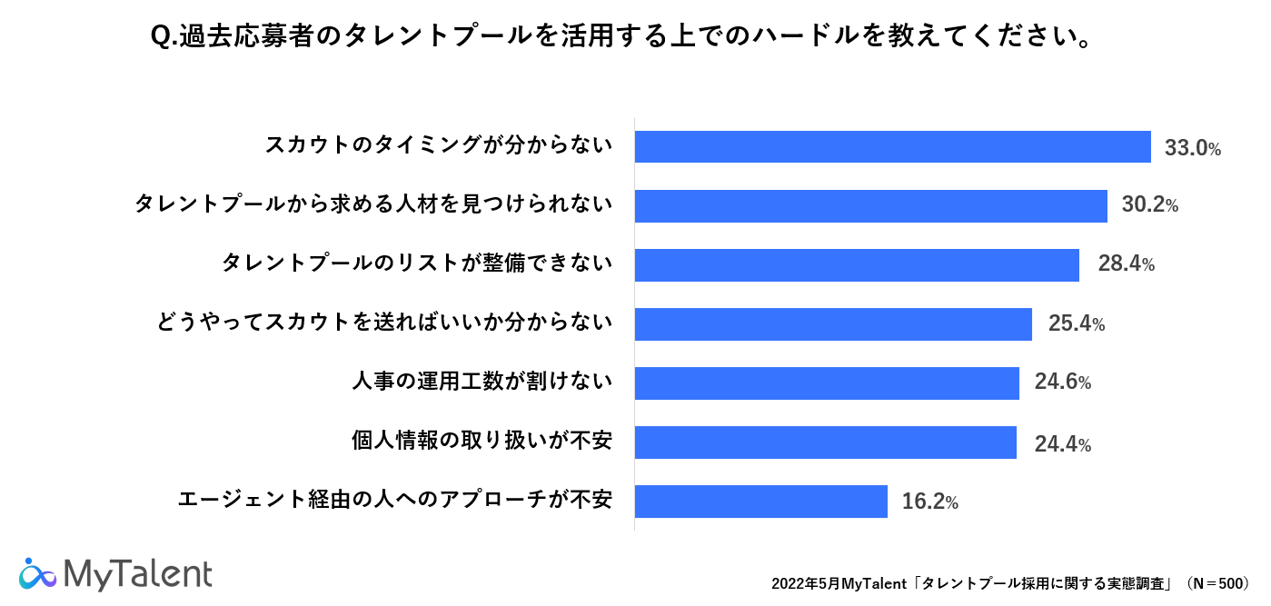 過去応募者のタレントプールを活用する上では「スカウトのタイミングが分からない」(33.0%)、「タレントプールから求める人材を見つけられない」(30.2%)、「タレントプールのリストを整備できない」(28.4%)ことがハードルになっています。