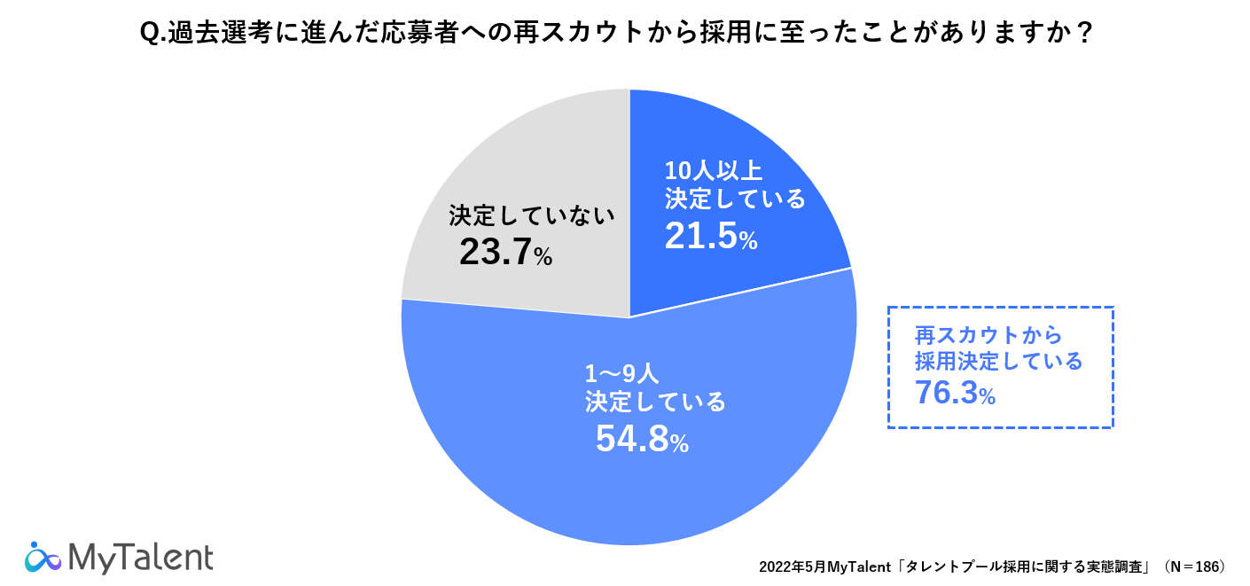 過去選考に進んだ応募者への再スカウトによって、「10人以上決定している」(21.5%)、「1~9人決定している」(54.8%)と約8割の会社で採用実績があると分かりました。